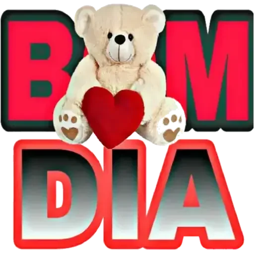 Um ursinho de pelúcia bege com um coração vermelho na frente, em cima das letras 'BOM DIA' em vermelho e preto.