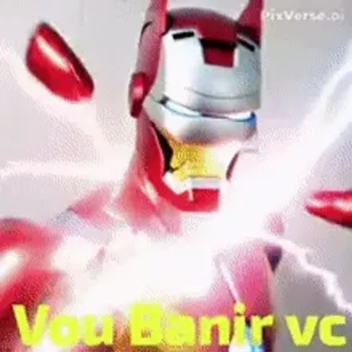 Iron Man com armadura vermelha e dourada, olhos fechados, com eletricidade ao redor e texto 'vou banir vc' em amarelo na parte inferior.