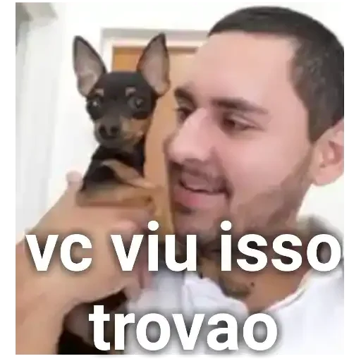 Um homem com um cachorro preto e marrom na mão, com o texto 'vc viu isso trovao' sobreposto.