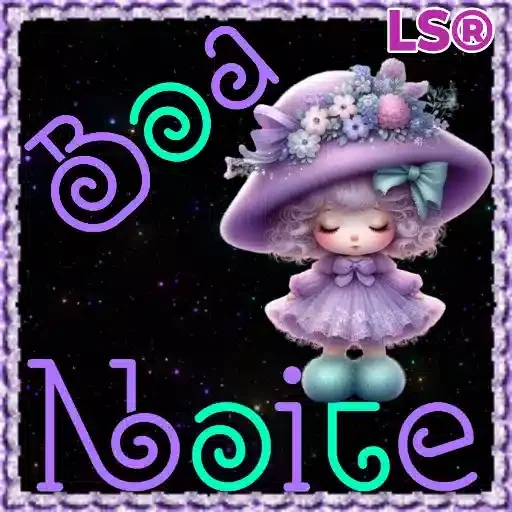 Uma menina fofa com chapéu roxo e vestido roxo, com o texto 'Boa Noite' em cores roxa e verde. Ela tem olhos fechados e um laço no chapéu.