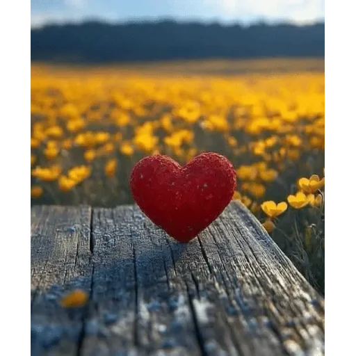 Um coração vermelho brilhante sobre uma tábua de madeira, com um campo de flores amarelas desfocado ao fundo.