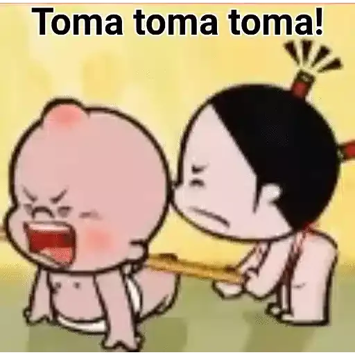 Um bebê chorando enquanto é puxado por uma criança mais velha com uma expressão séria, com o texto 'Toma toma toma!'