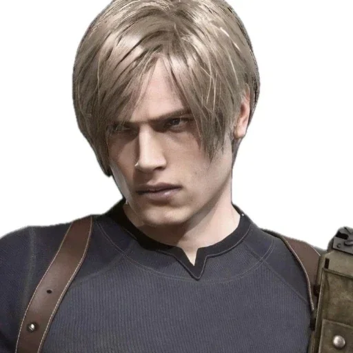 Personagem de jogo com cabelo loiro e expressão séria, vestindo uma camisa azul escura e uma alça marrom, com uma arma…