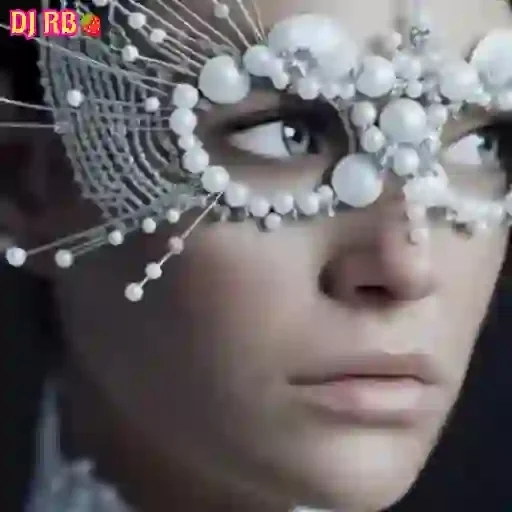 Rosto de uma mulher com uma máscara ou adorno sobre os olhos, feito de contas brancas e fios prateados. Ela tem uma expressão séria e um olhar direto.