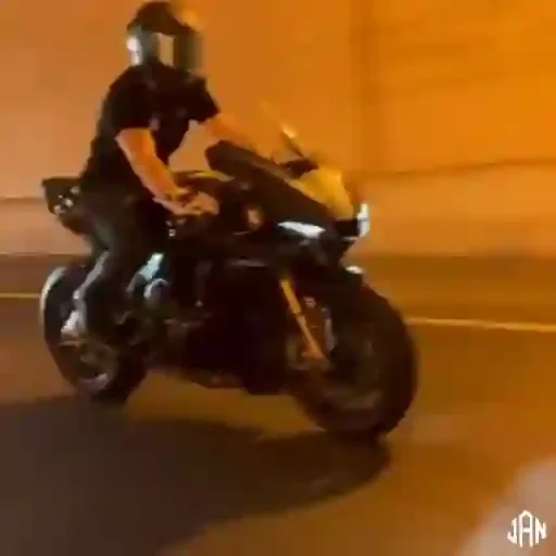 Um motociclista de preto pilotando uma moto preta em uma estrada com iluminação alaranjada.