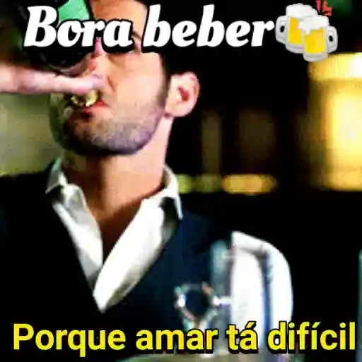Homem com expressão séria, vestindo camisa branca e colete, com texto "Bora beber" na parte superior e "Porque amar tá difícil" na parte inferior.