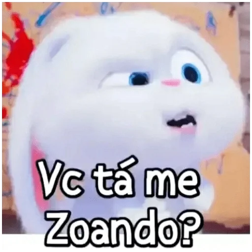Um coelho branco com olhos azuis e expressão surpresa, com o texto 'Vc tá me Zoando?' sobreposto.
