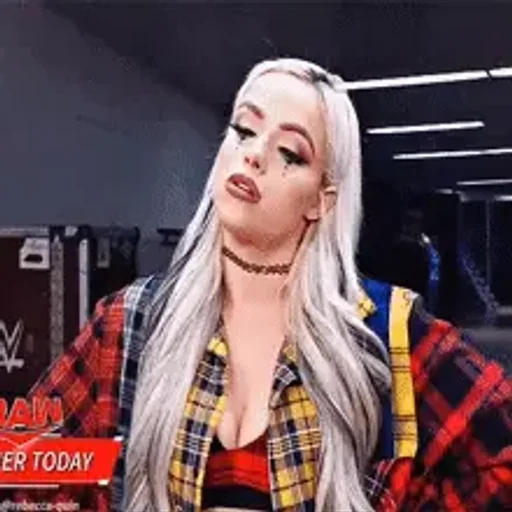 Uma mulher com cabelo loiro longo e uma jaqueta xadrez vermelha e preta olha para cima com uma expressão facial pensativa. Ela está vestindo um top vermelho por baixo da jaqueta e um colar preto no pescoço. Há um texto 'ER TODAY' em uma faixa vermelha no canto inferior esquerdo.