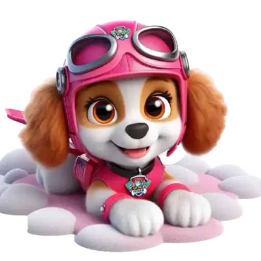 Cachorro fofinho com focinho branco e orelhas castanhas, usando um capacete rosa de piloto com óculos. Ele está deitado em nuvens fofas.