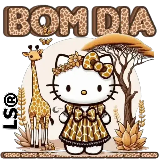 Hello Kitty vestida com um vestido laranja e preto, ao lado de uma girafa e uma árvore, com o texto 'BOM DIA' em letras grandes e decoradas.