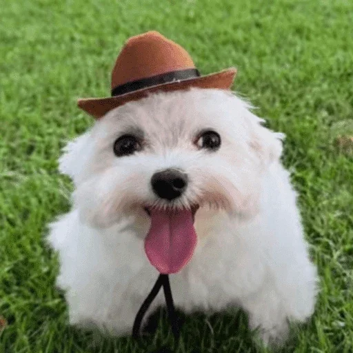 Cachorro branco com a língua de fora, usando um chapéu marrom tipo cowboy, em um gramado verde.