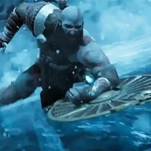 Personagem musculoso e careca com armadura preta e prateada, voando com uma prancha prateada em um fundo azul com neve.
