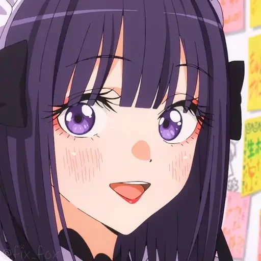 Garota de anime com cabelo roxo escuro e olhos roxos, bochechas rosadas e sorriso tímido.