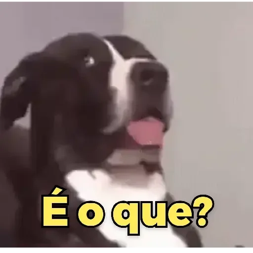 Um cachorro preto com marcações brancas na cara e no peito, com a língua para fora e a expressão confusa, ao lado do texto 'É o que?' em amarelo.