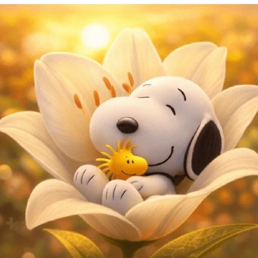 Snoopy e o passarinho Woodstock estão dentro de uma flor, com o sol ao fundo. Snoopy está com os olhos fechados e um sorriso no rosto.