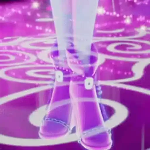 Pernas de uma pessoa com meias e sapatos transparentes sobre um fundo roxo com círculos brancos e luzes.