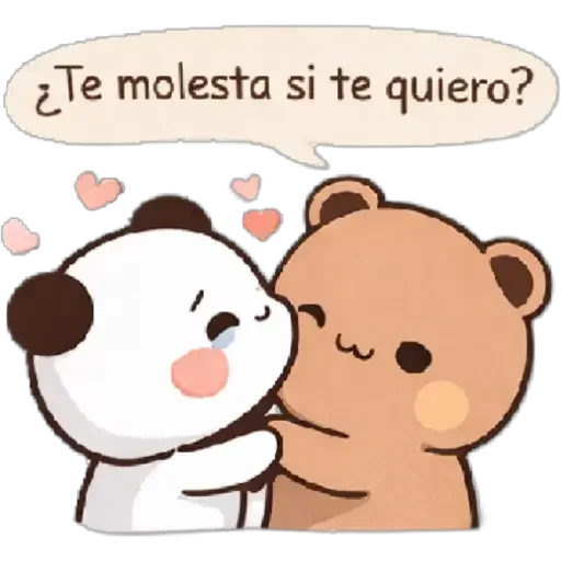 Dois animais fofos, um branco e um castanho, se abraçam com corações ao redor. O animal branco diz: '¿Te molesta si te quiero?'