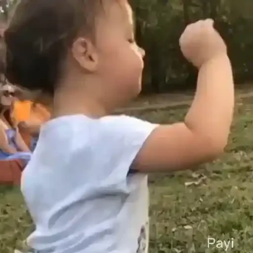 Menino pequeno com cabelo castanho e camiseta branca fazendo força com o braço direito, com um fundo de grama e uma pessoa ao fundo.