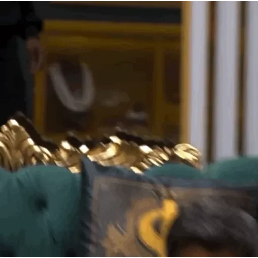Um close-up de uma águia com penas verdes e douradas, olhos amarelos, em um ambiente com detalhes dourados ao fundo.