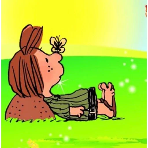 Menina deitada no gramado, olhando para uma abelha que está em seu nariz, com expressão de surpresa. Ela tem cabelos castanhos e veste uma blusa marrom.