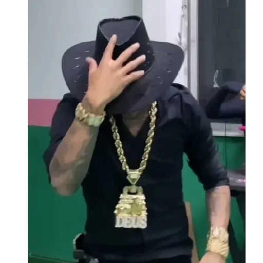 Homem negro com uma corrente de ouro e um chapéu preto, cobrindo o rosto com a mão.