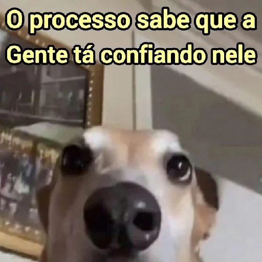 Um cachorro com olhos arregalados e focados na câmera, com texto em português "O processo sabe que a Gente tá confiando nele".