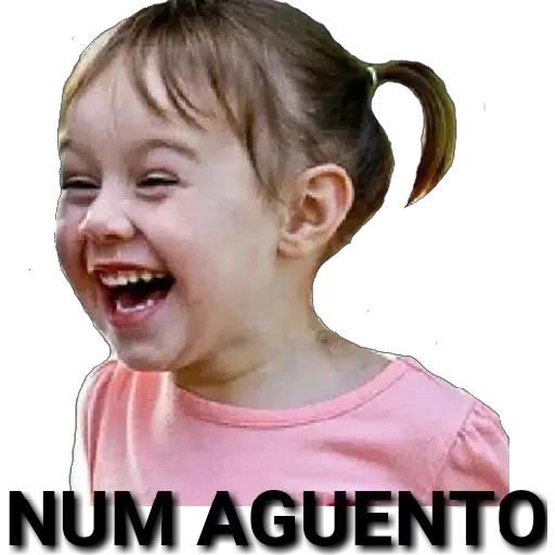 Menina loira com o cabelo em um rabo de cavalo sorrindo com a boca aberta e texto 'NUM AGUENTO' embaixo.