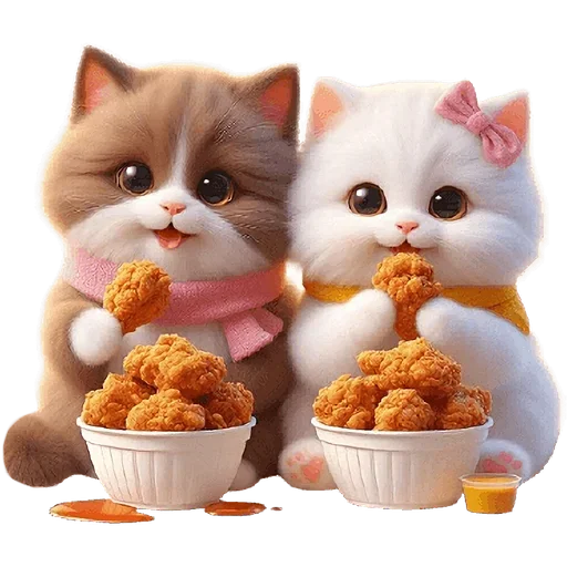 Dois gatos, um castanho e um branco com laço rosa, comem frango frito de tigelas.