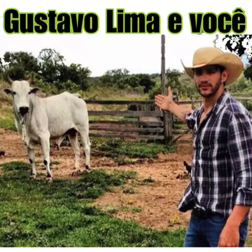 Um homem com chapéu e camisa xadrez aponta para um boi branco em um pasto, com a legenda 'Gustavo Lima e você'.