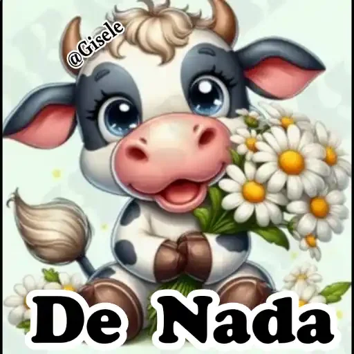 Vaca cartoon fofa com flores, olhos grandes e expressão simpática. A vaca tem manchas pretas e coroa de flores na cabeça, com o texto 'De Nada' embaixo.