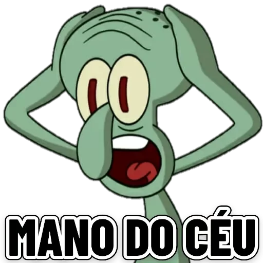 Um personagem verde, parecido com um monstro ou alienígena, com as mãos na cabeça e expressão de surpresa ou desespero. Abaixo dele, está escrito 'MANO DO CÉU'.