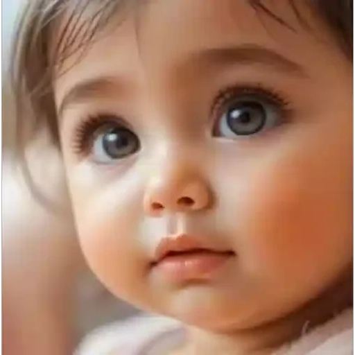 Rosto de bebê com expressão curiosa e olhos arregalados, olhando para o lado com uma luz ao fundo.