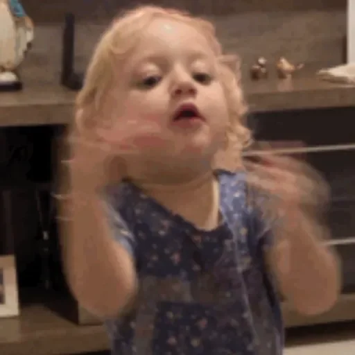 Menina loira com expressão de surpresa ou choque, mãos ao lado da cabeça, vestindo uma blusa azul com estampas.