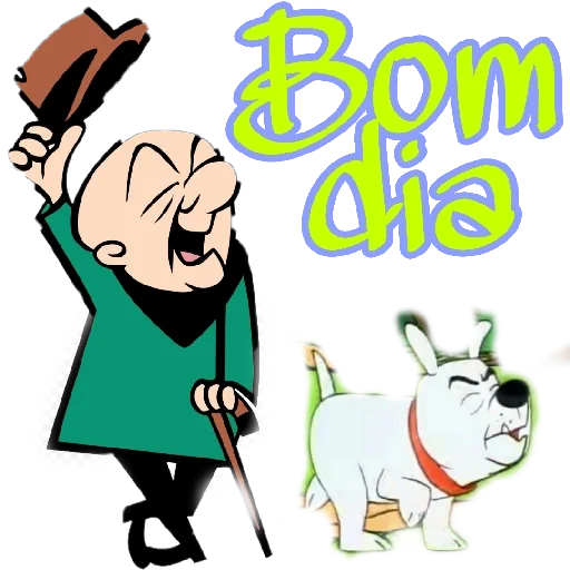 Um homem careca com um casaco verde e um cão branco ao lado, ambos sorrindo. O homem segura um chapéu e um bastão. 'Bom dia' está escrito acima deles.
