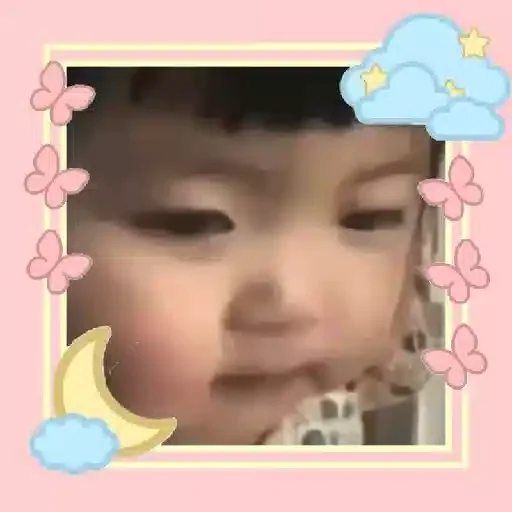Rosto de uma criança com expressão fofa, enquadrado por um contorno amarelo com decorações de borboletas cor-de-rosa, nuvens azuis e uma lua amarela.