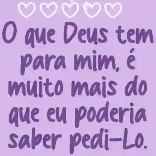 Uma figurinha com texto em roxo sobre fundo lilás. O texto em português diz 'O que Deus tem para mim, é muito mais do que eu poderia saber pedir-Lo.' e é acompanhado de cinco corações brancos no topo.
