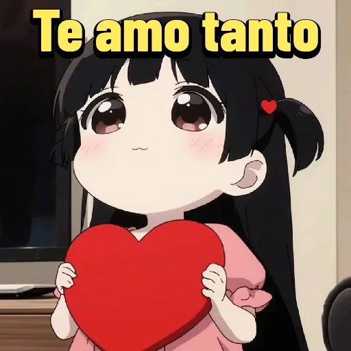 Uma menina de anime com cabelos pretos e um coração vermelho na mão, com o texto 'Te amo tanto' em amarelo. Ela tem um pequeno coração vermelho no cabelo e está vestida de rosa.
