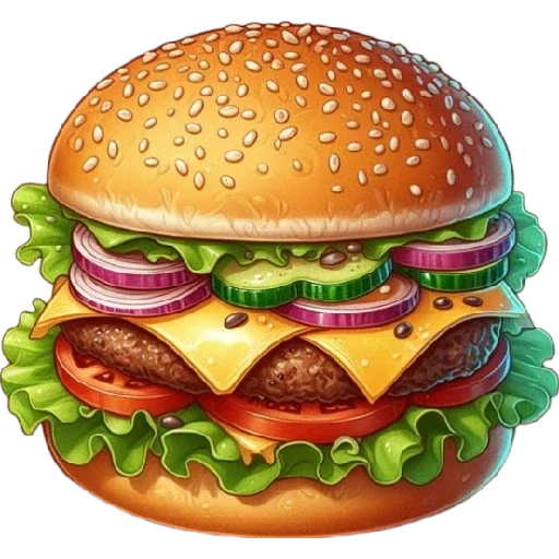 Um hambúrguer com queijo, alface, tomate, pepino, cebola roxa e carne de boi, em um pão com sementes.