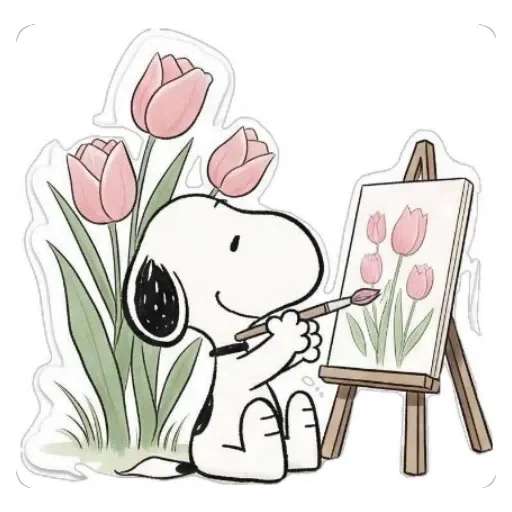 Snoopy pinta tulipas rosa em um cavalete, com mais tulipas ao lado.