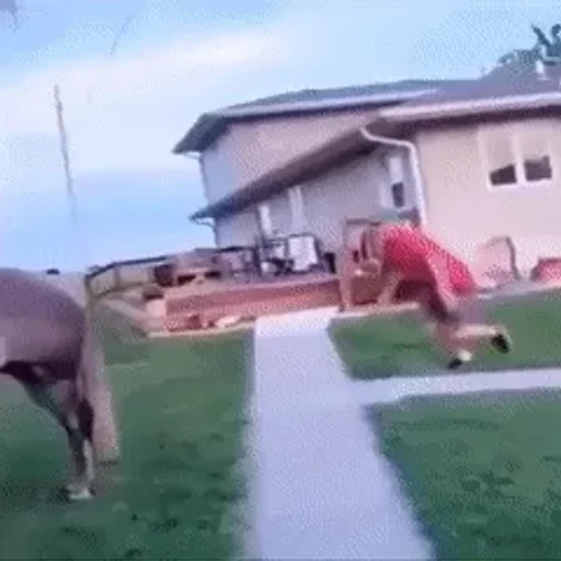 Um cervo e um homem com camisa vermelha em um jardim com uma casa ao fundo.