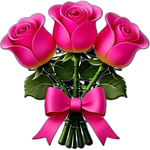 Um buquê de três rosas pink com folhas verdes e um laço rosa.