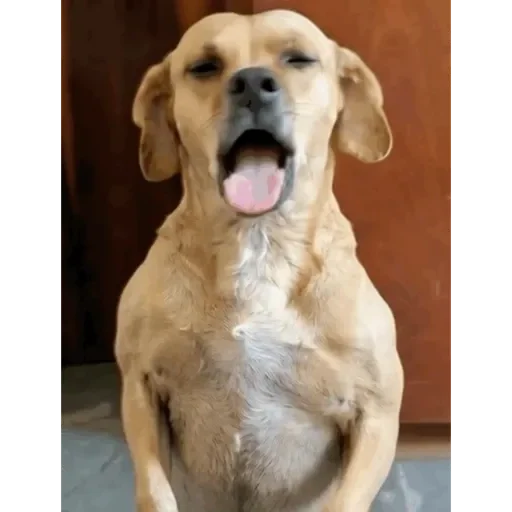 Um cachorro amarelo com a língua para fora e olhos semicerrados, parecendo relaxado ou sonolento.