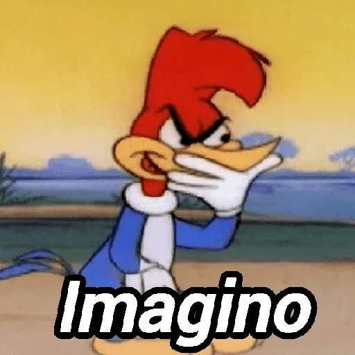 Um pica-pau cartoon com penas vermelhas e bico laranja, vestindo uma camisa azul e branca, aparece com uma expressão facial zangada e a mão na bochecha. A palavra 'Imagino' está escrita abaixo dele.