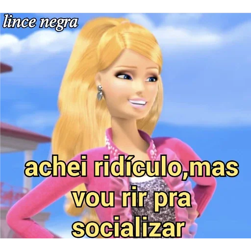 Boneca Barbie com cabelo loiro e roupa rosa, sorrindo e com texto 'achei ridículo, mas vou rir pra socializar' em amarelo.