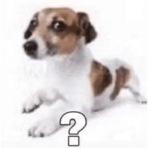 Cachorro deitado com expressão curiosa, olhar para o lado, com um ponto de interrogação na frente. Pelagem branca com manchas marrons.