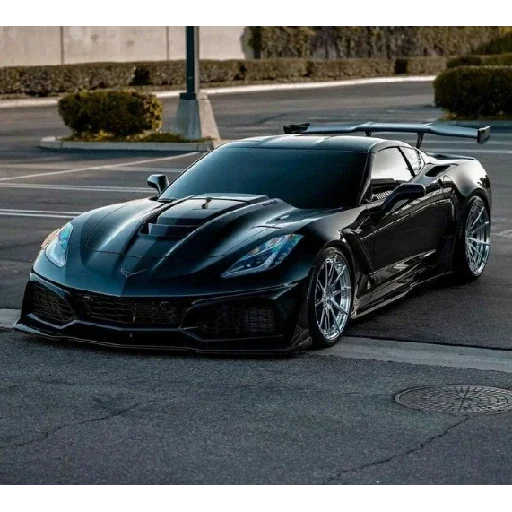 Um carro esportivo preto estacionado em uma rua asfaltada com faixa branca no chão. O carro tem vidros escuros e um spoiler traseiro.