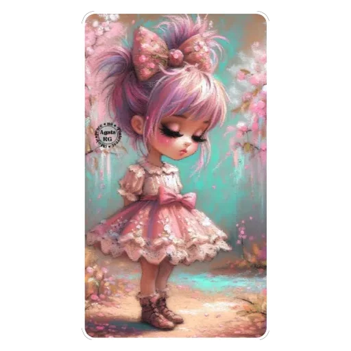 Menina fofa com cabelo rosa e laço grande no topo, vestindo um vestido rosa com babados e um laço na cintura, com olhos grandes e tristes.