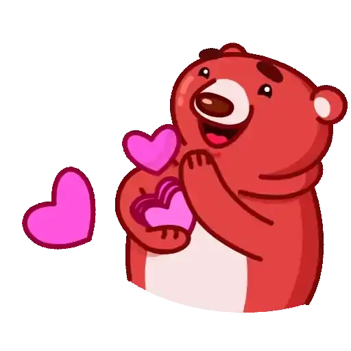 Um urso vermelho fofinho com um coração roxo na pata e dois corações rosa ao lado, com expressão feliz.