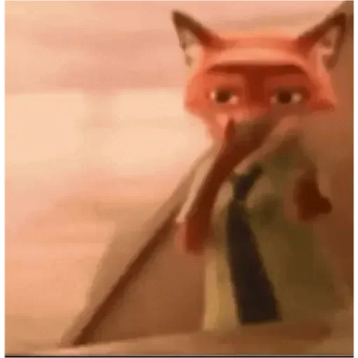 Raposa com expressão séria e dedo na boca, vestindo um terno com gravata preta.