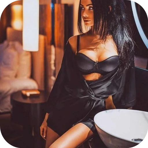 Mulher de lingerie preta sentada em um ambiente com iluminação quente.